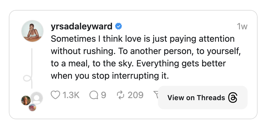 So much about love, as an action, requires us to focus, to be present, to stop interrupting that feeling with distractions and addictions and time sucks. To stop disassociating on our phones.